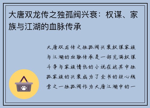大唐双龙传之独孤阀兴衰:权谋、家族与江湖的血脉传承