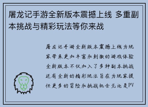 屠龙记手游全新版本震撼上线 多重副本挑战与精彩玩法等你来战
